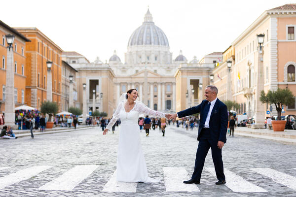 Patricia and Peter's Sposi Novelli Photoshoot in Rome was a delightful experience filled with elegance, historical charm, and the soft glow of Roman sunlight. The story began when Peter reached out to us, expressing the desire to immortalize the special moments following their audience with the Pope. Excitement filled the air as we prepared to capture the love and joy of this newlywed couple against the iconic backdrop of Rome. The agreed-upon itinerary for the shoot included two picturesque locations: Via della Conciliazione and Castel Sant'Angelo Bridge. These locations were not only visually stunning but also held significant historical and cultural value, providing the perfect setting for Patricia and Peter's special moments. As the day unfolded, the couple graced the lens with their elegance and love. Patricia, adorned in a beautiful gown, and Peter, looking dapper in his suit, exuded a timeless charm. The soft, character-filled light of Rome added a touch of magic to each frame, creating a visual narrative that beautifully complemented the significance of their Sposi Novelli. Via della Conciliazione, with its grandeur leading to St. Peter's Basilica, set the stage for regal portraits. The majestic Castel Sant'Angelo Bridge, spanning the Tiber River, provided a romantic and picturesque backdrop. Each step along these historic locations became a canvas for capturing the essence of this couple's love story. The shoot reached its climax on the tranquil Tiber riverbank, where the couple's connection was illuminated by the soft reflections of the white marble. The timeless beauty of Rome, coupled with Patricia and Peter's radiance, resulted in a collection of images that encapsulated the joy, love, and significance of their Sposi Novelli. In the end, the day concluded with a sense of fulfillment as we wrapped up the shoot on the Tiber riverbank. The photographs captured during Patricia and Peter's Sposi Novelli Photoshoot not only celebrated their love but also showcased the eternal allure of Rome as the perfect backdrop for such a special occasion.